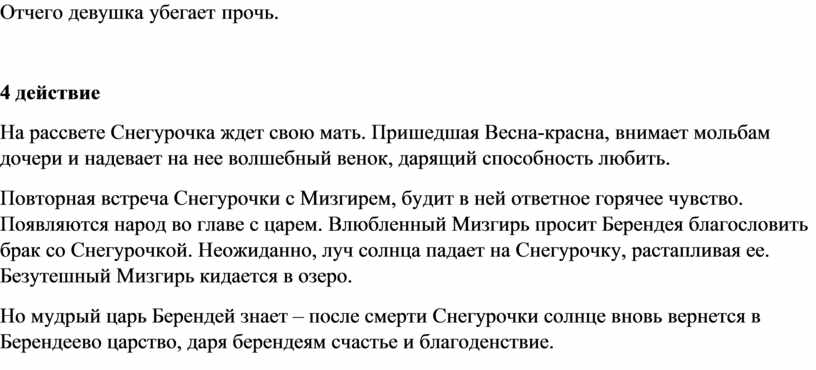 Повторная встреча Снегурочки с Мизгирем, будит в ней ответное горячее чувство. Появляются народ во главе с царем. Влюбленный Мизгирь просит Берендея благословить брак со Снегурочкой. Неожиданно, луч солнца падает на Снегурочку, растапливая ее. Безутешный Мизгирь кидается в озеро.
