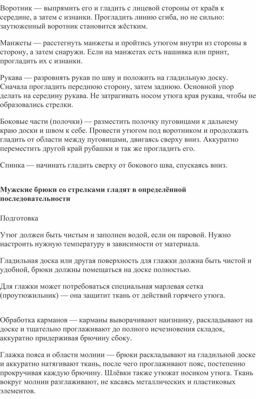 Глажка пояса и области молнии — брюки раскладывают на гладильной доске и аккуратно натягивают ткань, после чего проглаживают пояс, постепенно прокручивая каждую брючину. Шлёвки также утюжат носиком утюга. Ткань вокруг молнии разглаживают, не касаясь металлических и пластиковых элементов.