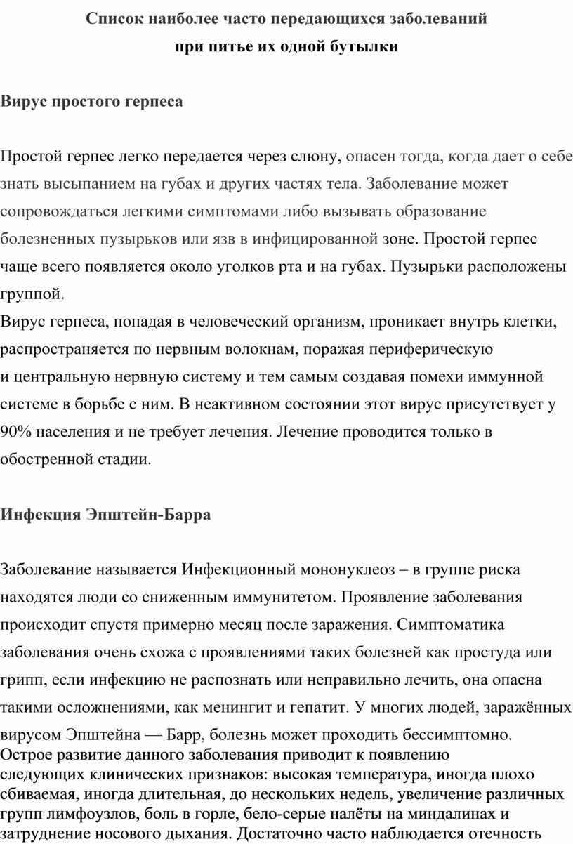 Список наиболее часто передающихся заболеваний при питье их одной бутылки
