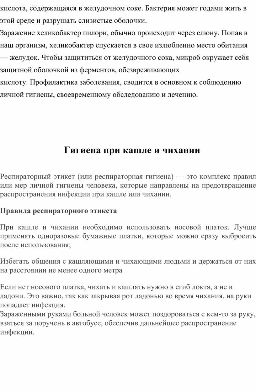 Заражение хеликобактер пилори, обычно происходит через слюну. Попав в наш организм, хеликобактер спускается в свое излюбленно место обитания — желудок. Чтобы защититься от желудочного сока, микроб окружает себя защитной оболочкой из ферментов, обезвреживающих кислоту. Профилактика заболевания, сводится в основном к соблюдению личной гигиены, своевременному обследованию и лечению.