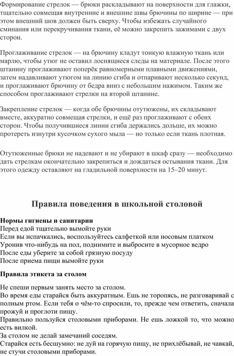Закрепление стрелок — когда обе брючины отутюжены, их складывают вместе, аккуратно совмещая стрелки, и ещё раз проглаживают с обеих сторон. Чтобы получившиеся линии сгиба держались дольше, их можно протереть изнутри кусочком сухого мыла — но только если ткань плотная.