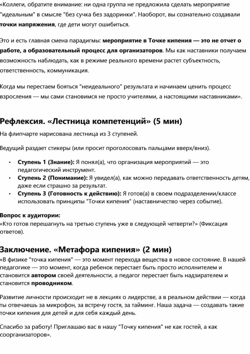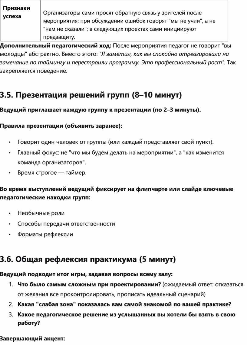 Дополнительный педагогический ход: После мероприятия педагог не говорит "вы молодцы" абстрактно. Вместо этого: "Я заметил, как вы спокойно отреагировали на замечание по таймингу и перестроили программу. Это профессиональный рост". Так закрепляется поведение.