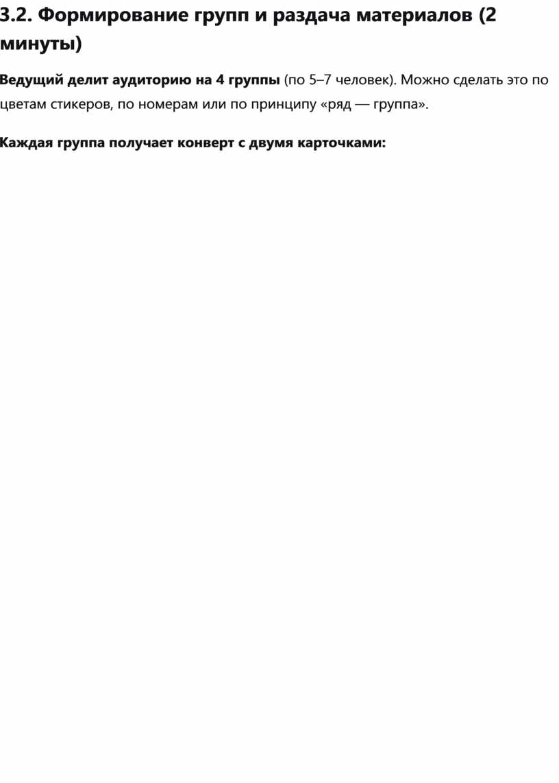 Ведущий делит аудиторию на 4 группы (по 5–7 человек). Можно сделать это по цветам стикеров, по номерам или по принципу «ряд — группа».
