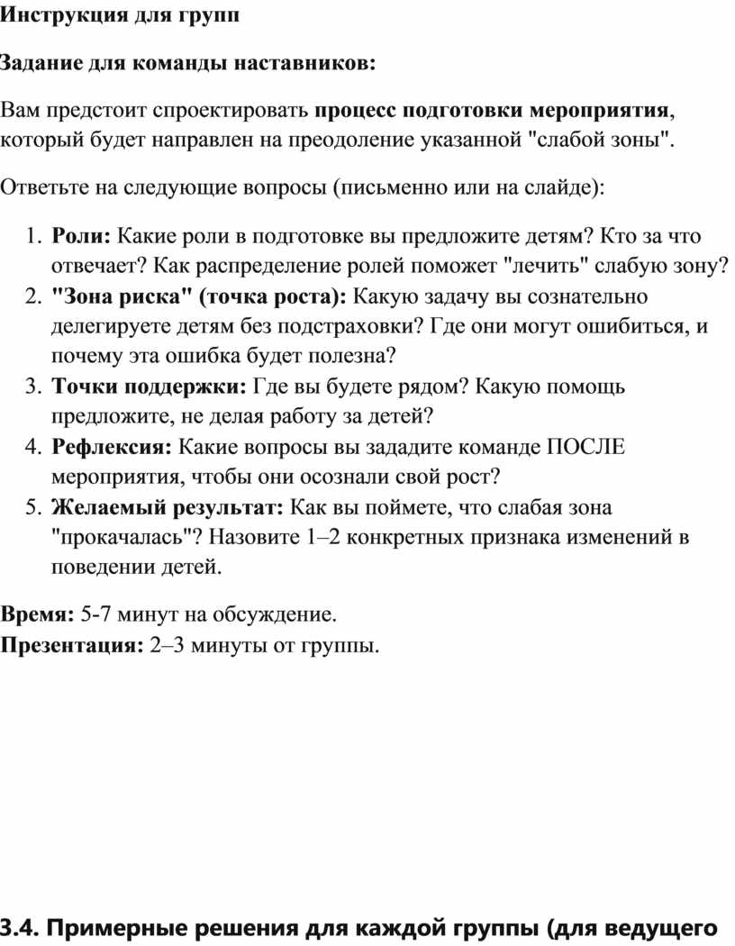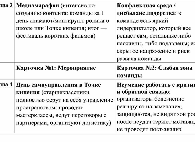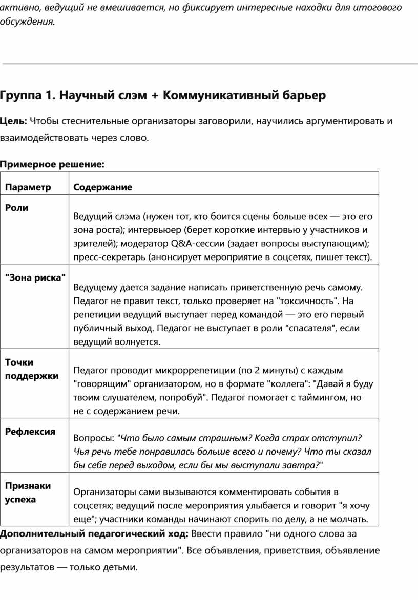Ваша задача за 12 минут спроектировать процесс подготовки мероприятия так, чтобы это мероприятие стало "лекарством" от их слабой зоны. Вы не просто придумываете название — вы прописываете педагогические ходы: кому какую роль дадите, где создадите "зону риска", где добавите поддержку, как проведете рефлексию.