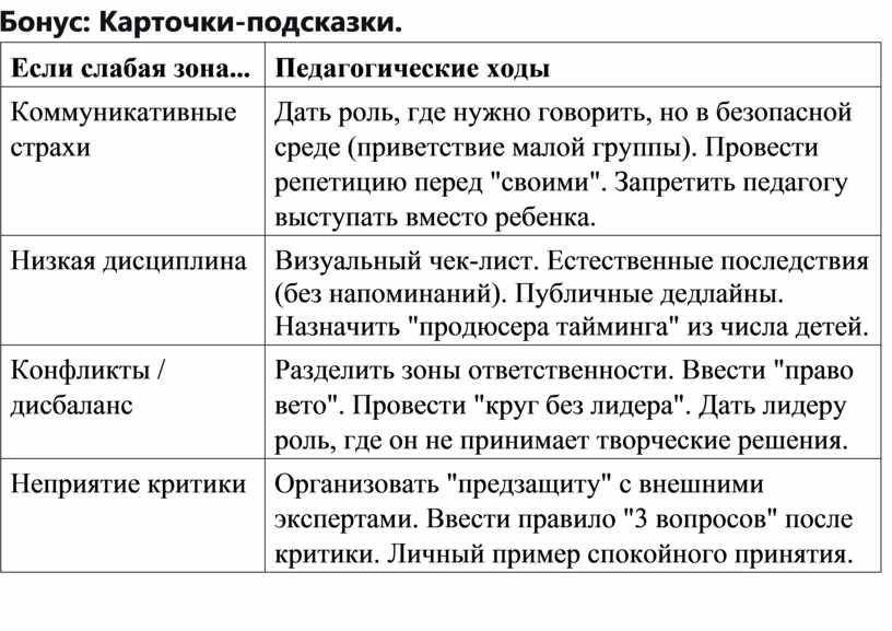 Педагог вводит правило "трех вопросов" после критики: 1) Что в этой критике по факту? 2) Что мы можем улучшить уже сейчас? 3) Кого поблагодарить за честность? Педагог сам демонстрирует спокойное принятие критики на своем примере, если ему что-то высказывают. |