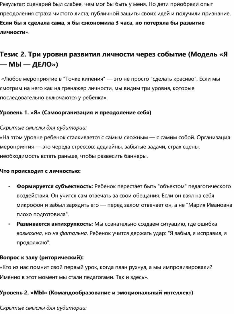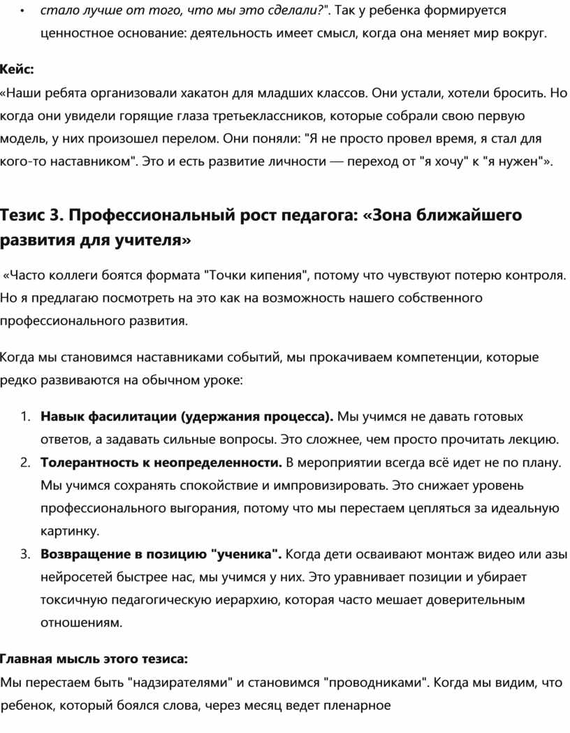 «Добрый день, коллеги. Я руководитель школьной "Точки кипения". Мы привыкли думать, что "Точка кипения" — это место для проектов, хакатонов или лекций. Но сегодня я хочу поговорить о том, что главный продукт нашей деятельности — это не мероприятия, а личность. Личность ребенка и, что немаловажно, личность педагога».
