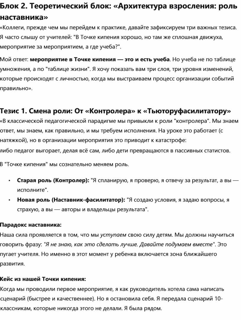 Этот блок рассчитан на 7–10 минут. Чтобы он не превратился в скучную лекцию, он структурирован как смысловая пирамида, где каждый тезис иллюстрируется метафорой, педагогическим парадоксом и примером из практики школьной «Точки кипения».