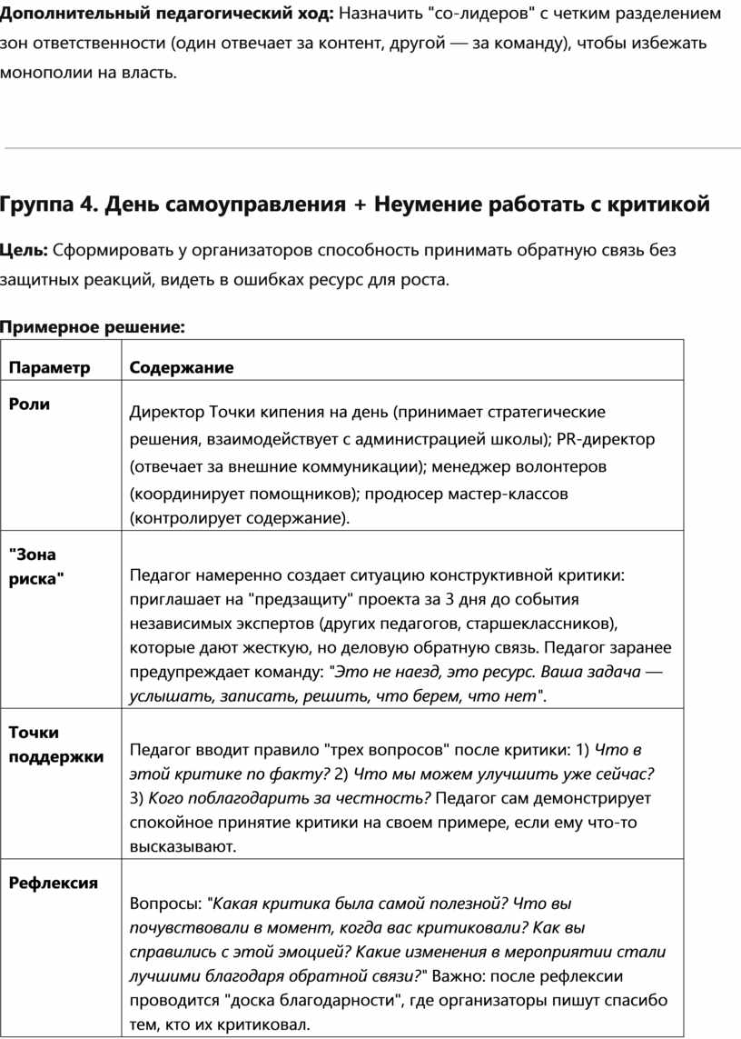 Педагог намеренно создает ситуацию конструктивной критики: приглашает на "предзащиту" проекта за 3 дня до события независимых экспертов (других педагогов, старшеклассников), которые дают жесткую, но деловую обратную связь. Педагог заранее предупреждает команду: "Это не наезд, это ресурс. Ваша задача — услышать, записать, решить, что берем, что нет". |