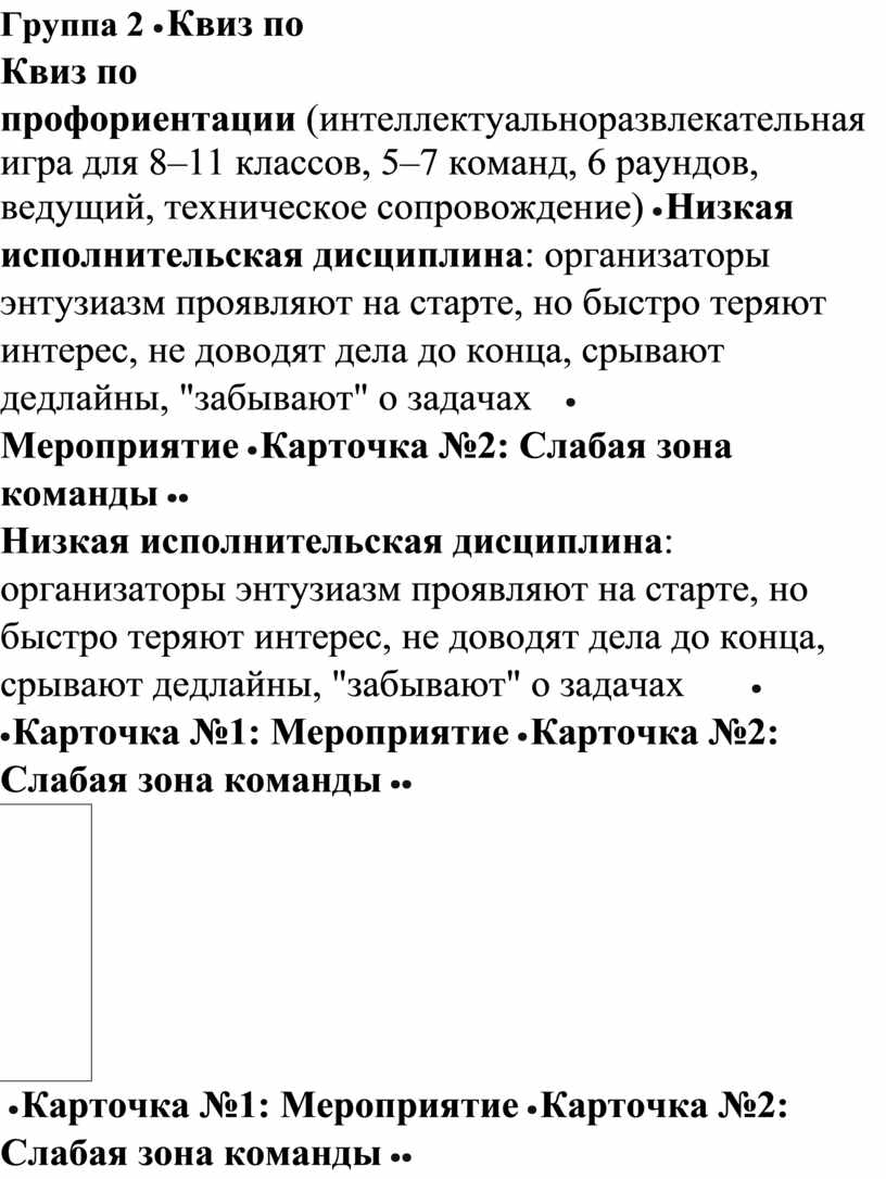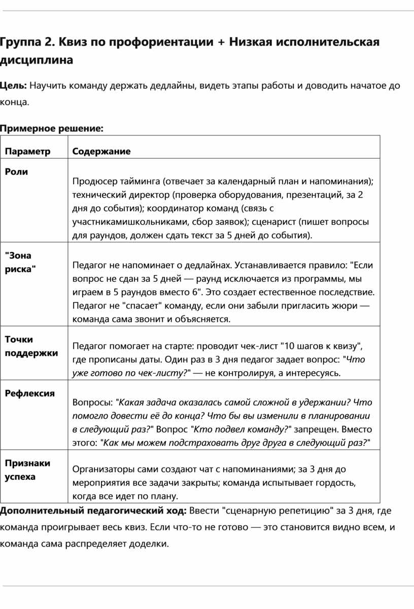 Дополнительный педагогический ход: Ввести "сценарную репетицию" за 3 дня, где команда проигрывает весь квиз. Если что-то не готово — это становится видно всем, и команда сама распределяет доделки.
