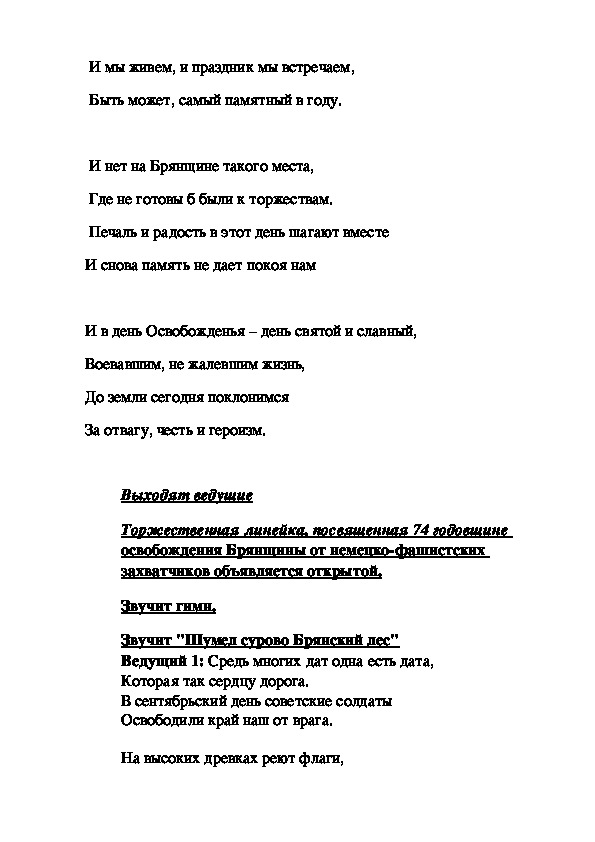 Сценарий торжественно линейки, посвященной Дню освобождения Брянщины от немецко-фашистских захватчиков. Эта дата вызывает в сердце каждого радость и горе, счастье и боль и великую гордость за свой народ, его мужество и героизм. На линейке выступил ветеран Великой Отечественной войны Родионов И.И.Сценарий торжественно линейки, посвященной Дню освобождения Брянщины от немецко-фашистских захватчиков. Эта дата вызывает в сердце каждого радость и горе, счастье и боль и великую гордость за свой народ, его мужество и героизм. На линейке выступил ветеран Великой Отечественной войны Родионов И.И.