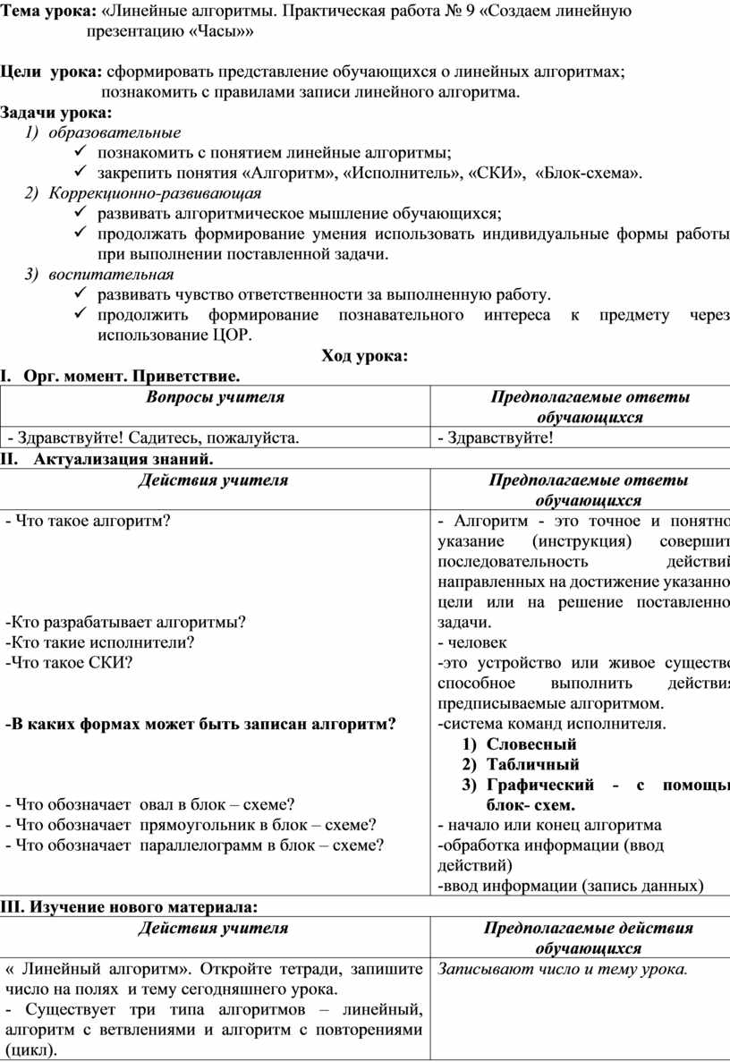 Тема урока: «Линейные алгоритмы. Практическая работа № 9 «Создаем линейную презентацию «Часы»»