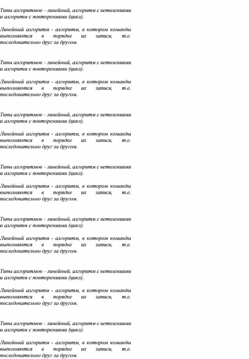 Типы алгоритмов – линейный, алгоритм с ветвлениями и алгоритм с повторениями (цикл).