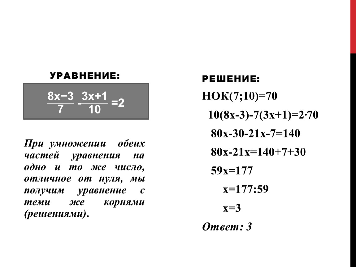 При умножении обеих частей уравнения на одно и то же число, отличное от нуля, мы получим уравнение с теми же корнями (решениями).
