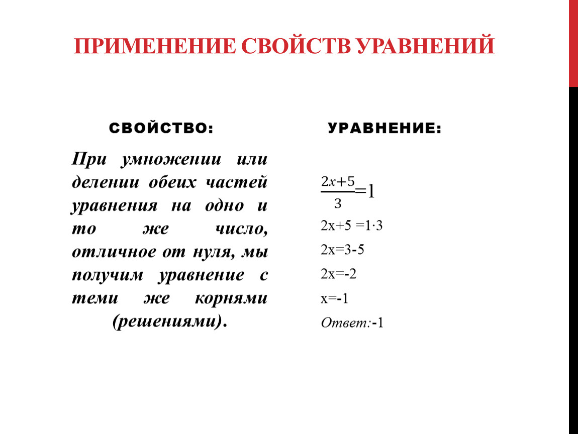 При умножении или делении обеих частей уравнения на одно и то же число, отличное от нуля, мы получим уравнение с теми же корнями (решениями).