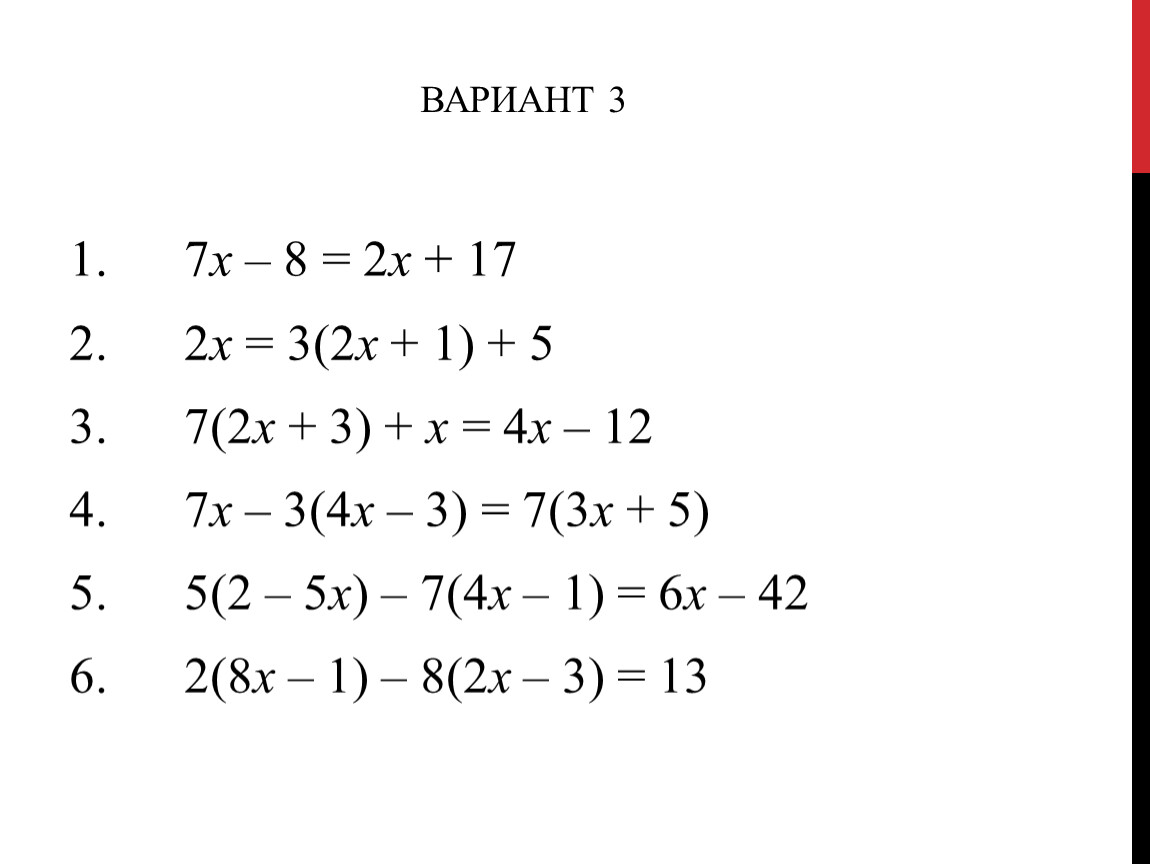 5. 5(2 – 5х) – 7(4х – 1) = 6х – 42