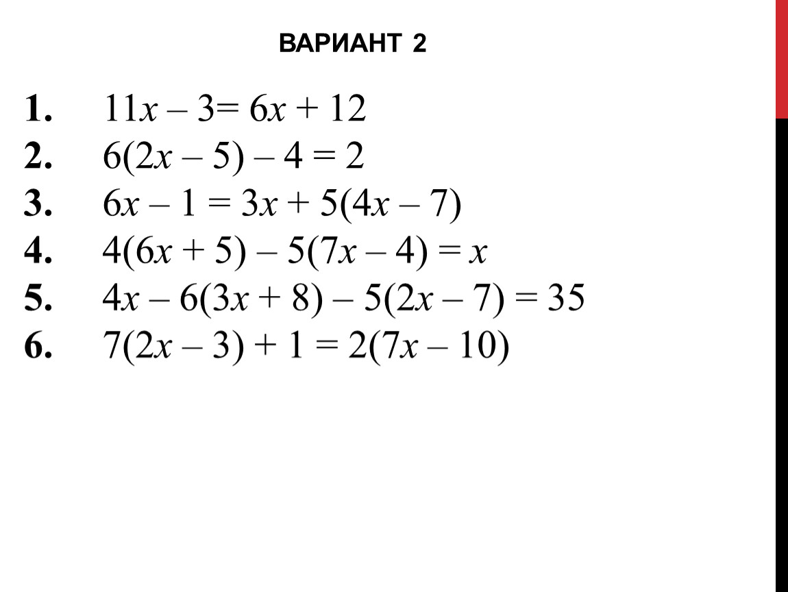 5. 4х – 6(3х + 8) – 5(2х – 7) = 35