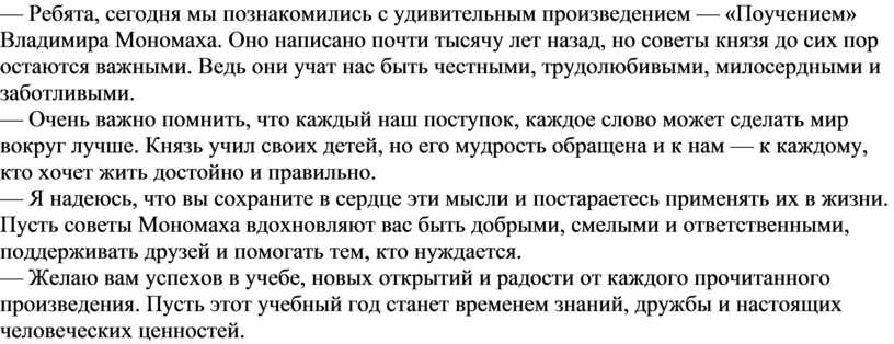 — Ребята, сегодня мы познакомились с удивительным произведением — «Поучением» Владимира Мономаха. Оно написано почти тысячу лет назад, но советы князя до сих пор остаются важными. Ведь они учат нас быть честными, трудолюбивыми, милосердными и заботливыми.