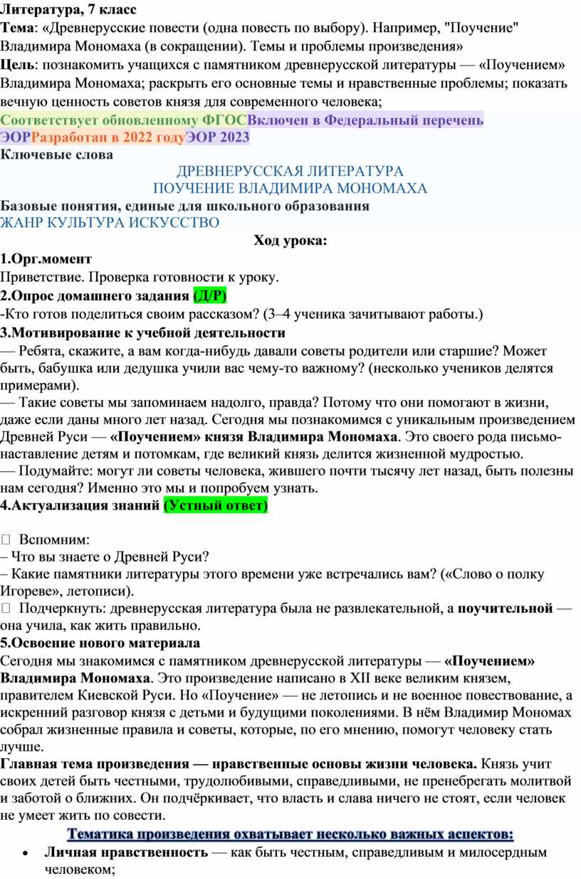 Тема: «Древнерусские повести (одна повесть по выбору). Например, "Поучение" Владимира Мономаха (в сокращении). Темы и проблемы произведения»