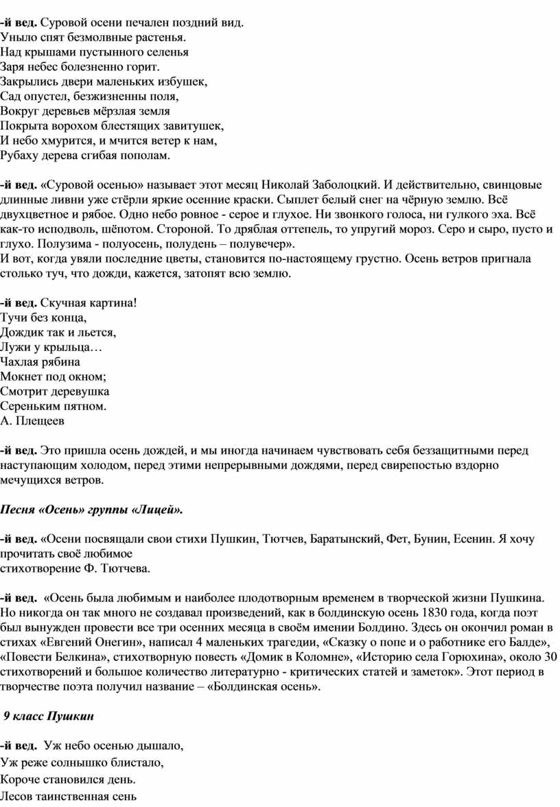 2-й вед. «Осень была любимым и наиболее плодотворным временем в творческой жизни Пушкина. Но никогда он так много не создавал произведений, как в болдинскую осень 1830 года, когда поэт был вынужден провести все три осенних месяца в своём имении Болдино. Здесь он окончил роман в стихах «Евгений Онегин», написал 4 маленьких трагедии, «Сказку о попе и о работнике его Балде», «Повести Белкина», стихотворную повесть «Домик в Коломне», «Историю села Горюхина», около 30 стихотворений и большое количество литературно - критических статей и заметок». Этот период в творчестве поэта получил название – «Болдинская осень».