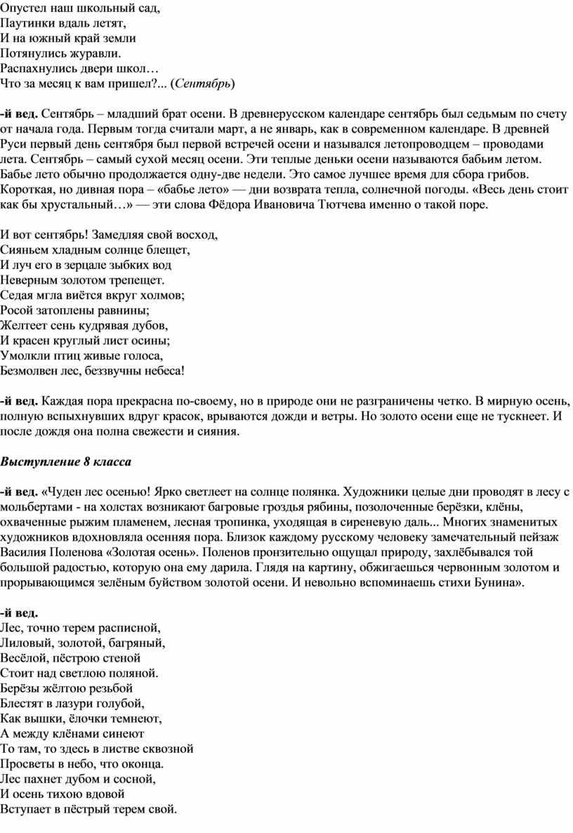 2-й вед. Осень – это удивительно прозрачный воздух, солнечный свет, иногда ярче летнего, но мягкий, ласкающий, не греющий; летящие блистающие нити паутины, листопад, краснеющие гроздья рябины, стаи птиц, улетающих на юг.