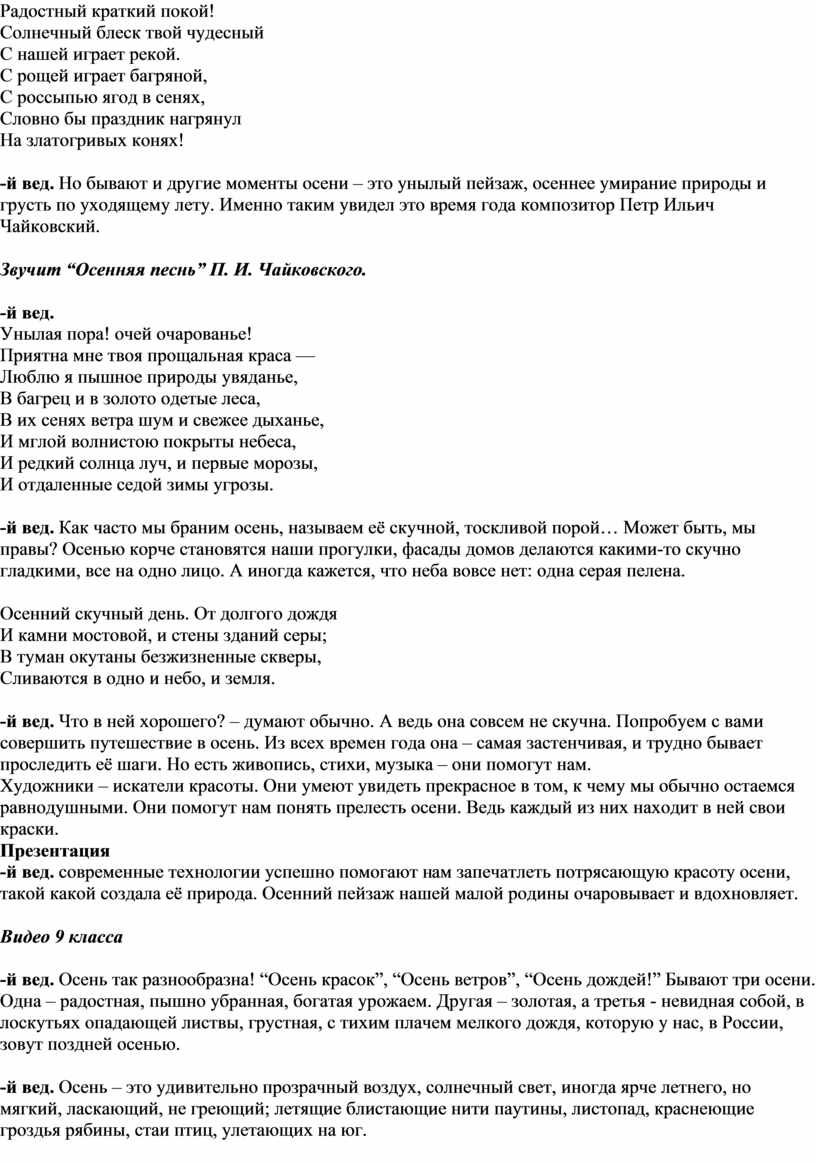 2-й вед. Но бывают и другие моменты осени – это унылый пейзаж, осеннее умирание природы и грусть по уходящему лету. Именно таким увидел это время года композитор Петр Ильич Чайковский.