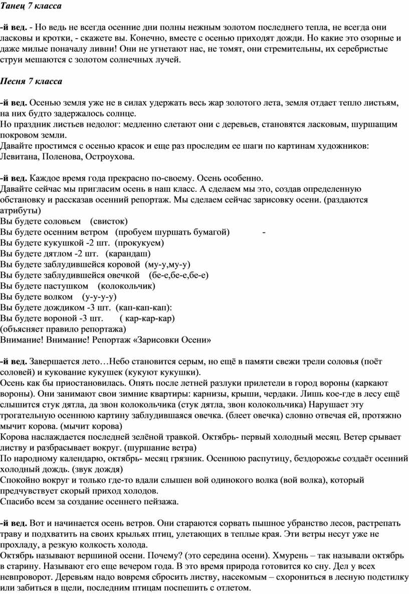 1-й вед. Осень так разнообразна! “Осень красок”, “Осень ветров”, “Осень дождей!” Бывают три осени. Одна – радостная, пышно убранная, богатая урожаем. Другая – золотая, а третья - невидная собой, в лоскутьях опадающей листвы, грустная, с тихим плачем мелкого дождя, которую у нас, в России, зовут поздней осенью.