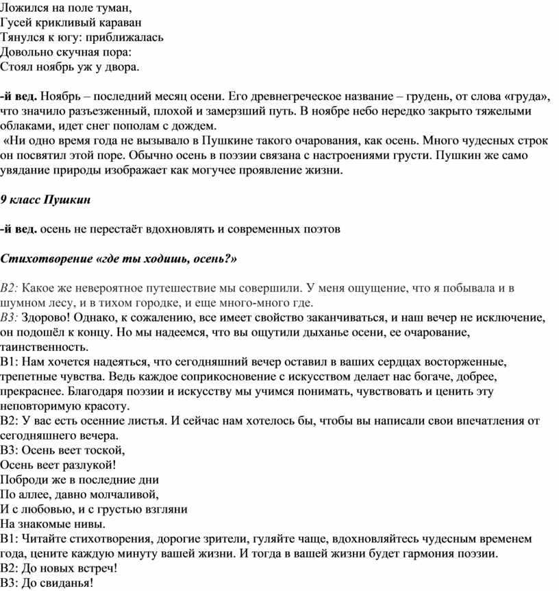 В3: Здорово! Однако, к сожалению, все имеет свойство заканчиваться, и наш вечер не исключение, он подошёл к концу. Но мы надеемся, что вы ощутили дыханье осени, ее очарование, таинственность.