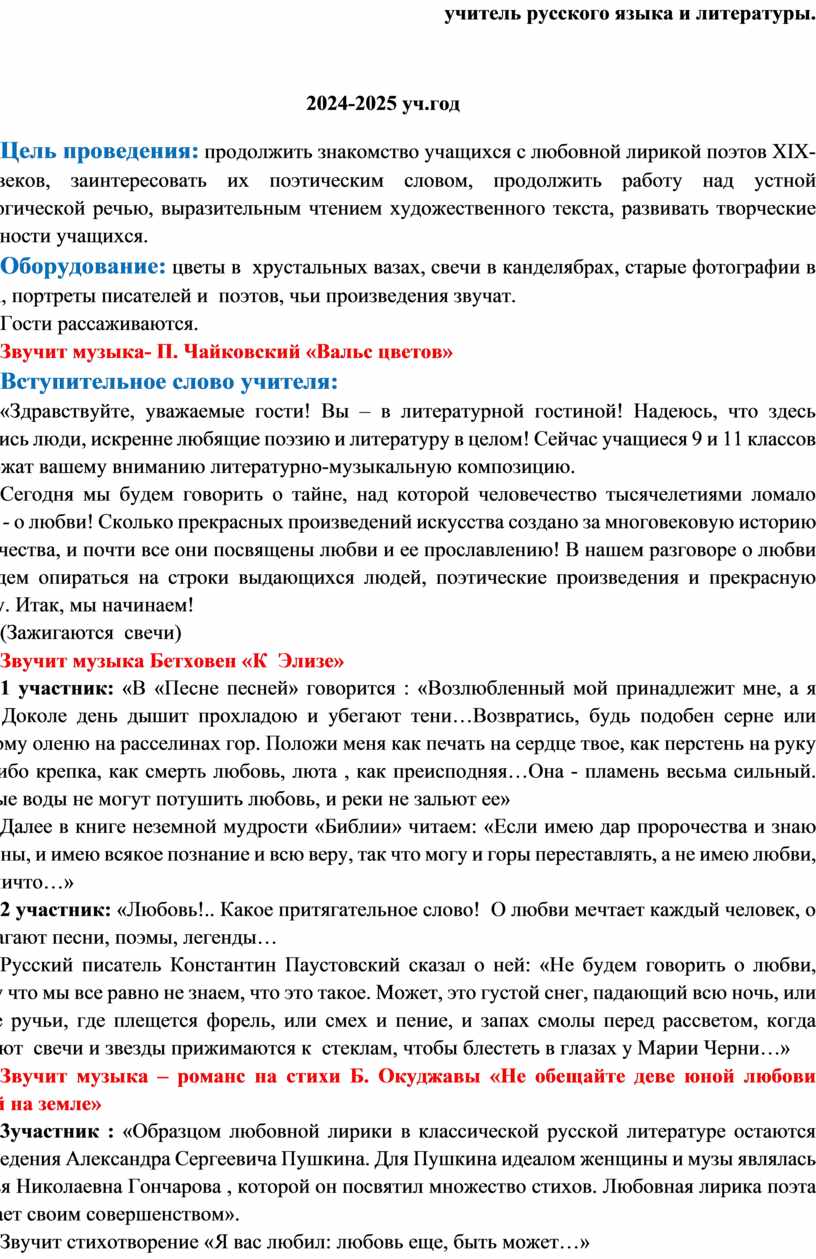 Цель проведения: продолжить знакомство учащихся с любовной лирикой поэтов XIX-XXI веков, заинтересовать их поэтическим словом, продолжить работу над устной монологической речью, выразительным чтением художественного текста, развивать творческие способности учащихся.