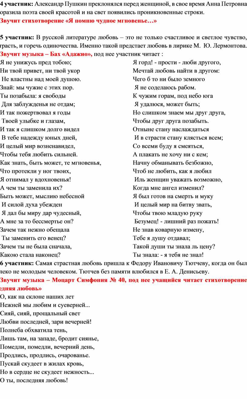 Звучит музыка – Моцарт Симфония № 40, под нее учащийся читает стихотворение «Последняя любовь»