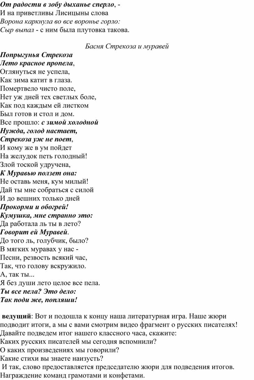 ведущий: Вот и подошла к концу наша литературная игра. Наше жюри подводит итоги, а мы с вами смотрим видео фрагмент о русских писателях! Давайте подведем итог нашего классного часа, скажите: