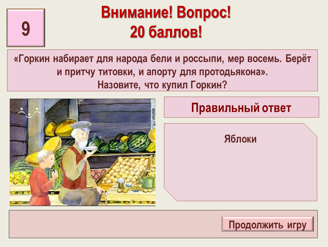 «Горкин набирает для народа бели и россыпи, мер восемь. Берёт и притчу титовки, и апорту для протодьякона». Назовите, что купил Горкин?
