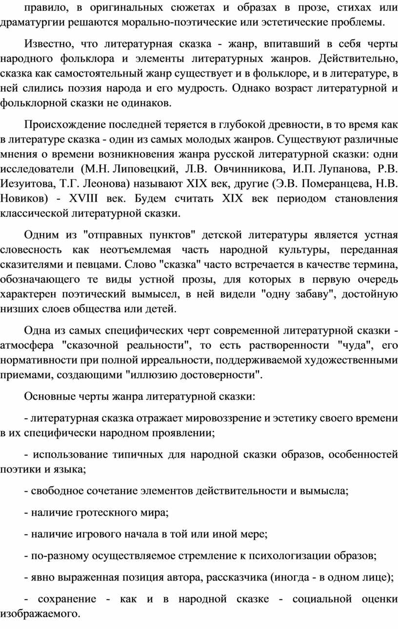 Происхождение последней теряется в глубокой древности, в то время как в литературе сказка - один из самых молодых жанров. Существуют различные мнения о времени возникновения жанра русской литературной сказки: одни исследователи (М.Н. Липовецкий, Л.В. Овчинникова, И.П. Лупанова, Р.В. Иезуитова, Т.Г. Леонова) называют XIX век, другие (Э.В. Померанцева, Н.В. Новиков) - XVIII век. Будем считать XIX век периодом становления классической литературной сказки.