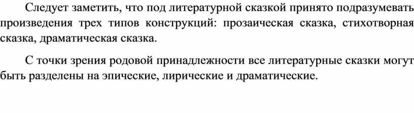 Следует заметить, что под литературной сказкой принято подразумевать произведения трех типов конструкций: прозаическая сказка, стихотворная сказка, драматическая сказка.