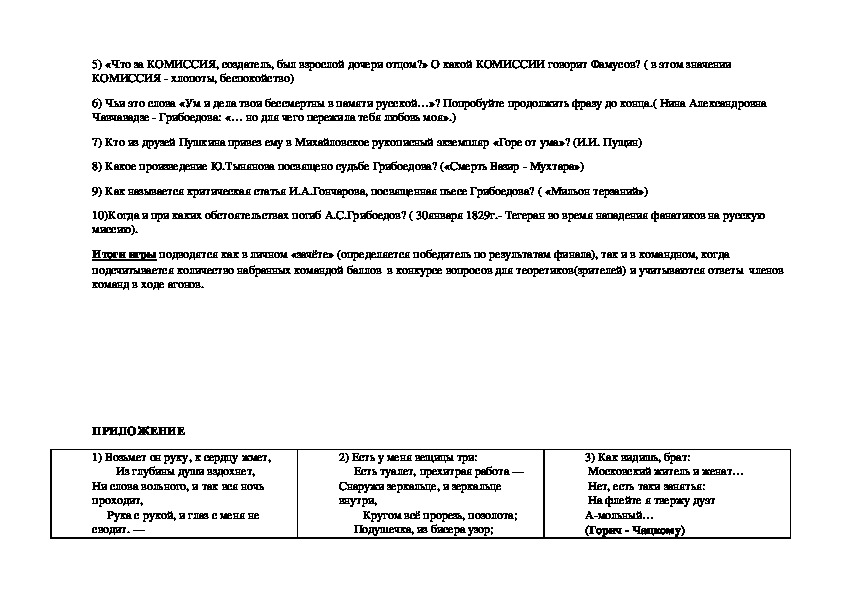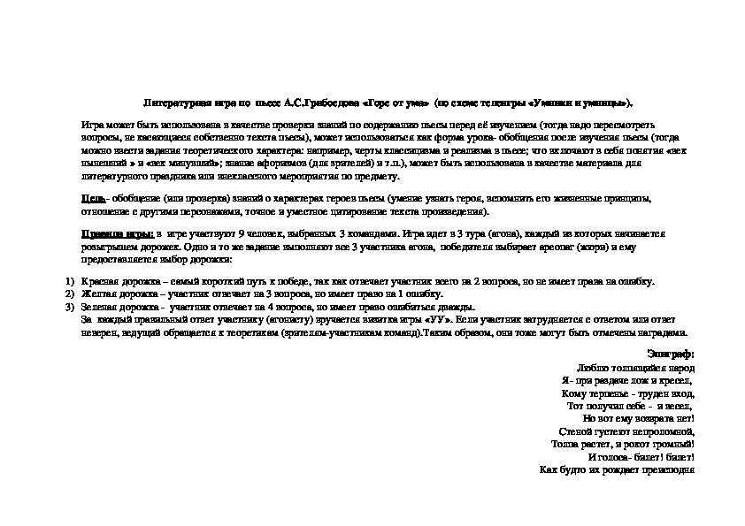 Игра может быть использована в качестве проверки знаний по содержанию пьесы перед её изучением (тогда надо пересмотреть вопросы, не касающиеся собственно текста пьесы), может использоваться как форма урока- обобщения после изучения пьесы (тогда можно ввести задания теоретического характера: например, черты классицизма и реализма в пьесе; что включают в себя понятия «век нынешний » и «век минувший»; знание афоризмов (для зрителей) и т.п.), может быть использована в качестве материала для литературного праздника или внеклассного мероприятия по предмету.