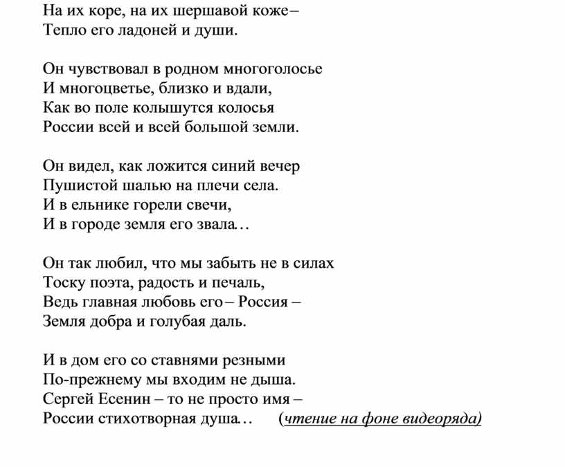 Природу России Есенин всегда воспринимал чутким сердцем русского человека, очеловечивал её: черёмуха спит в белой накидке, сосна подвязалась белою косынкой, роща отговорила веселым языком… Родину он называл «страной берёзового ситца». (Танец «Берёзка»)