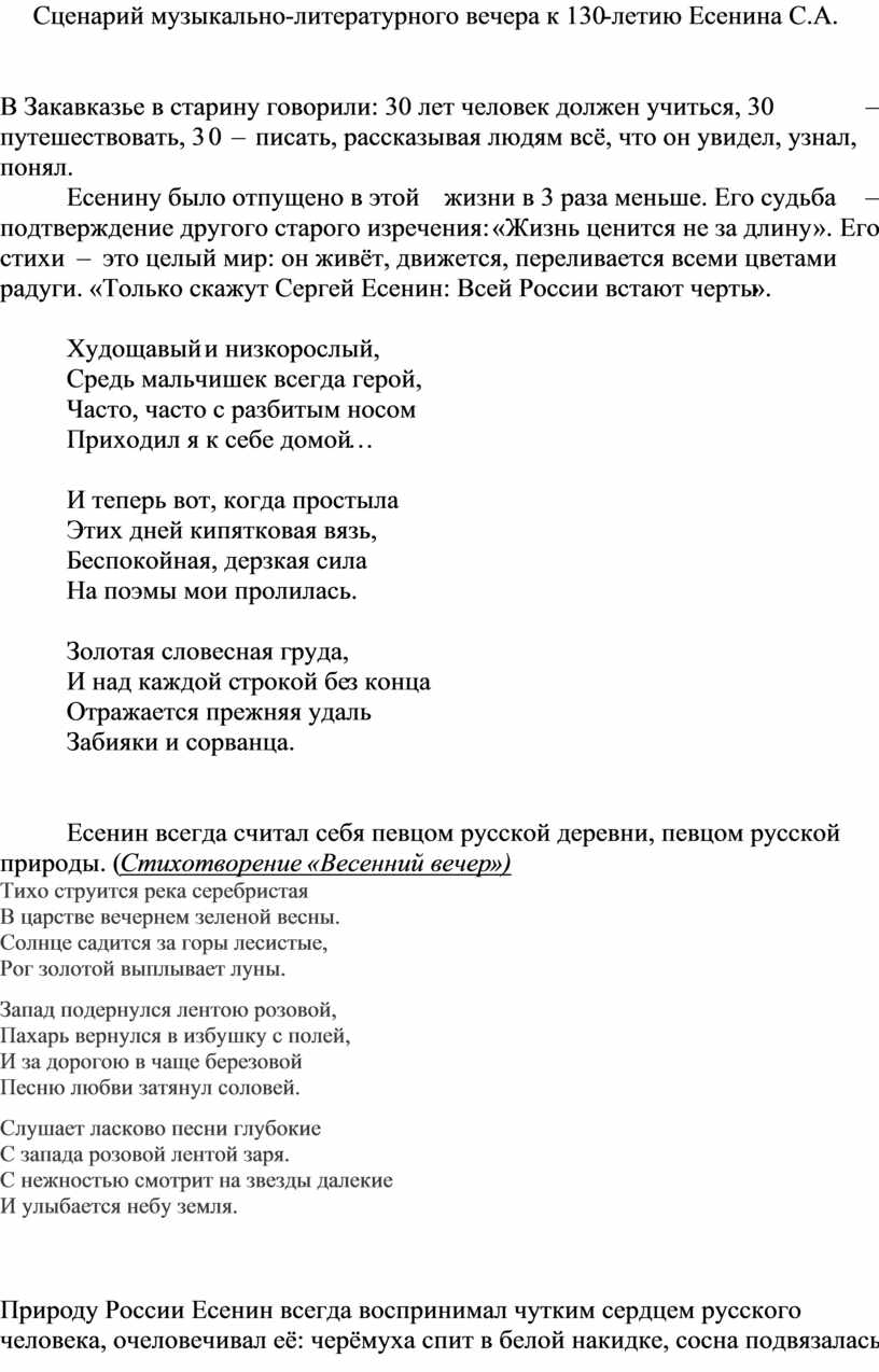 Сценарий музыкально-литературного вечера к 130-летию Есенина С.А.