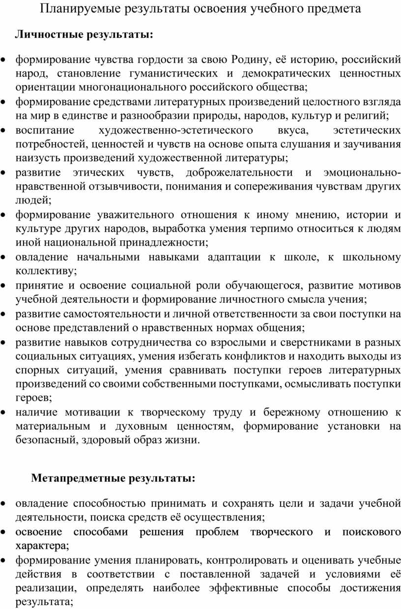· осознание значимости чтения для личного развития; формирование представлений о Родине и её людях, окружающем мире, культуре, первоначальных этических представлений, понятий о добре и зле, дружбе, честности; формирование потребности в систематическом чтении;