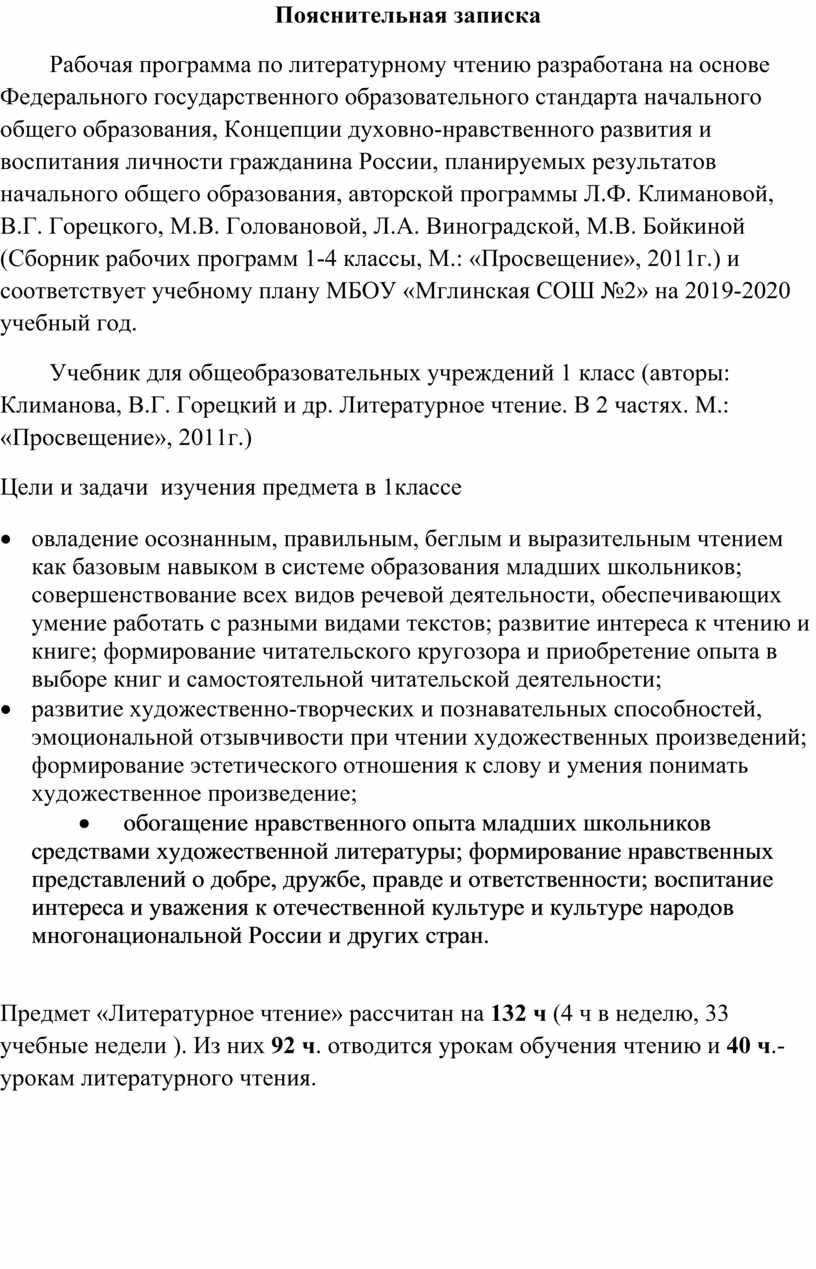 Рабочая программа по литературному чтению разработана на основе Федерального государственного образовательного стандарта начального общего образования, Концепции духовно-нравственного развития и воспитания личности гражданина России, планируемых результатов начального общего образования, авторской программы Л.Ф. Климановой, В.Г. Горецкого, М.В. Головановой, Л.А. Виноградской, М.В. Бойкиной (Сборник рабочих программ 1-4 классы, М.: «Просвещение», 2011г.) и соответствует учебному плану МБОУ «Мглинская СОШ №2» на 2019-2020 учебный год.