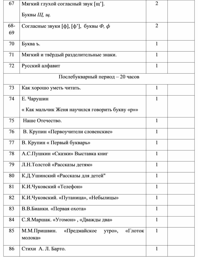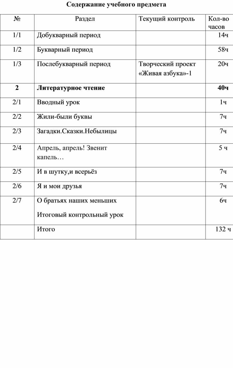 Предмет «Литературное чтение» рассчитан на 132 ч (4 ч в неделю, 33 учебные недели ). Из них 92 ч. отводится урокам обучения чтению и 40 ч.- урокам литературного чтения.