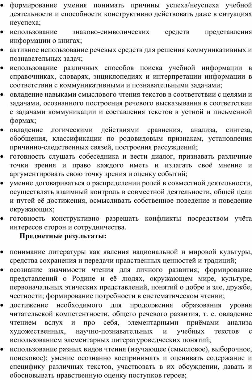 · достижение необходимого для продолжения образования уровня читательской компетентности, общего речевого развития, т. е. овладение чтением вслух и про себя, элементарными приёмами анализа художественных, научно-познавательных и учебных текстов с использованием элементарных литературоведческих понятий;