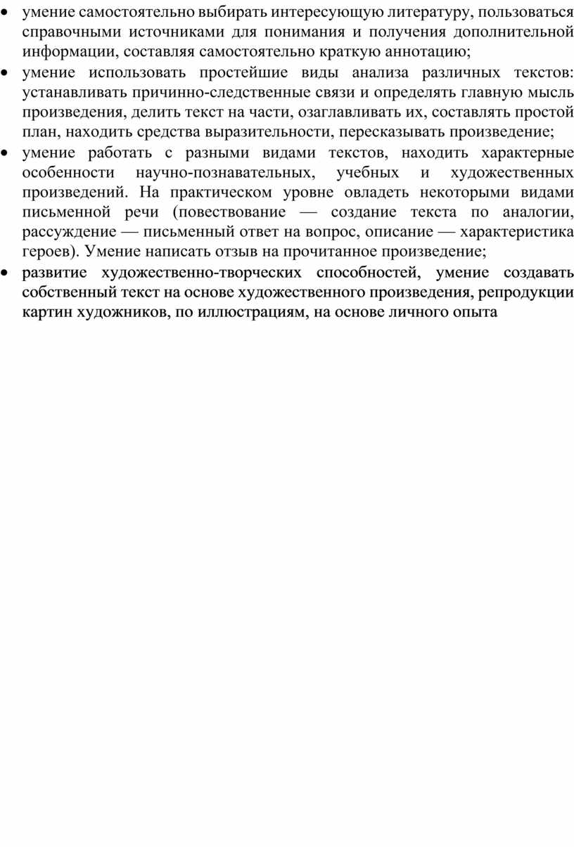 · умение работать с разными видами текстов, находить характерные особенности научно-познавательных, учебных и художественных произведений. На практическом уровне овладеть некоторыми видами письменной речи (повествование — создание текста по аналогии, рассуждение — письменный ответ на вопрос, описание — характеристика героев). Умение написать отзыв на прочитанное произведение;