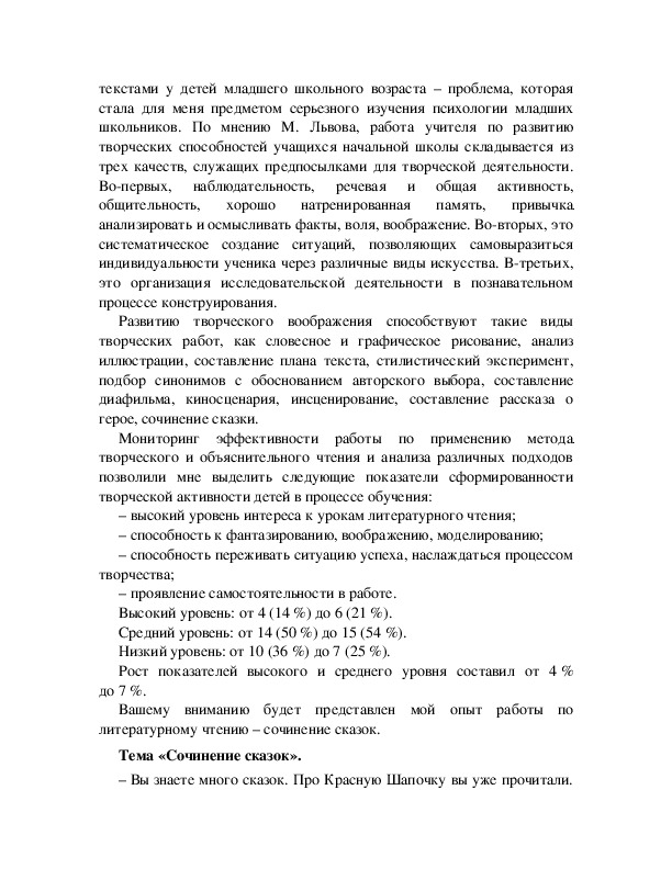 Развитие творческих способностей при работе с художественнымитекстами у детей младшего школьного возраста – проблема, которая