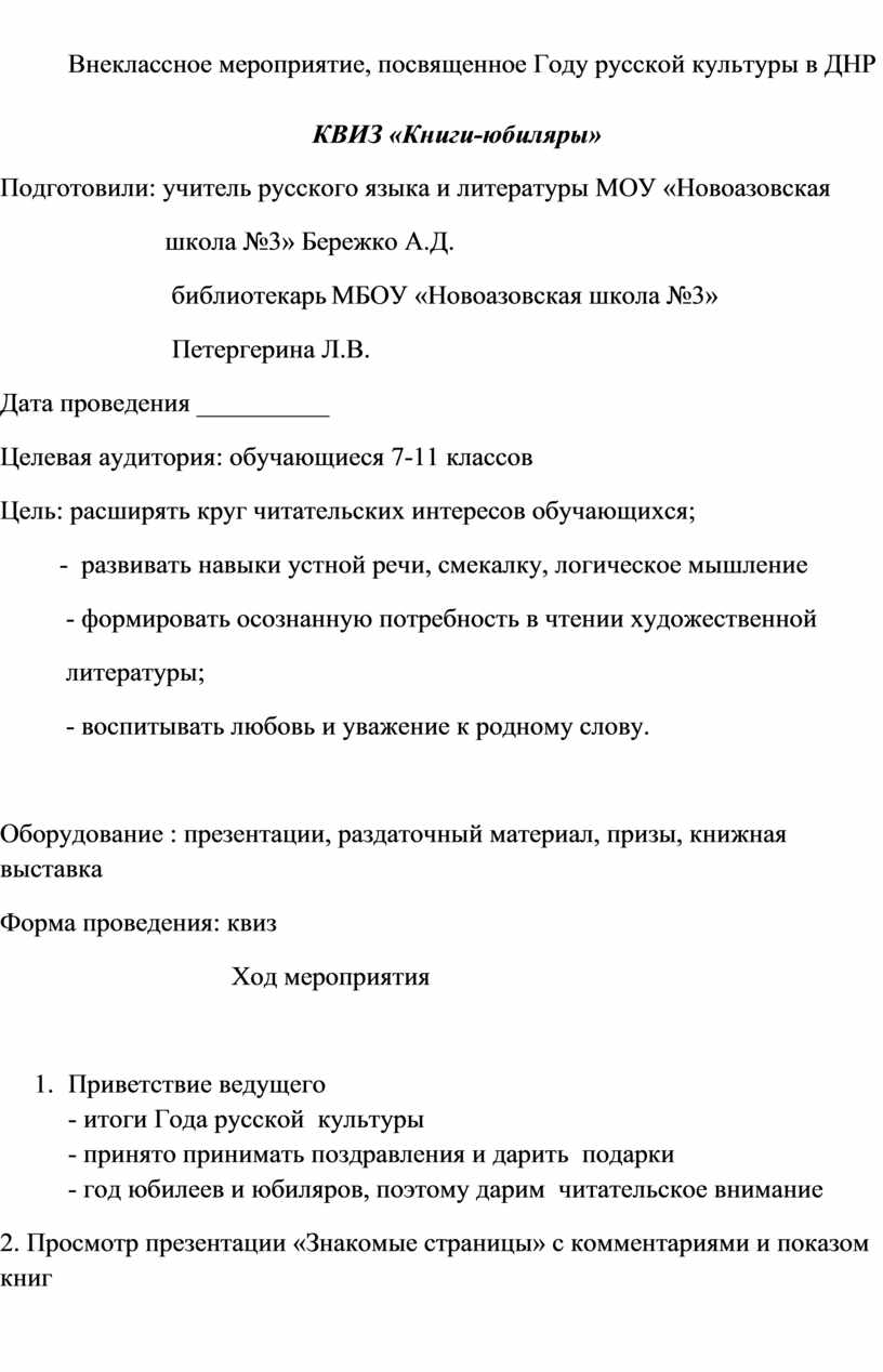 Внеклассное мероприятие, посвященное Году русской культуры в ДНР
