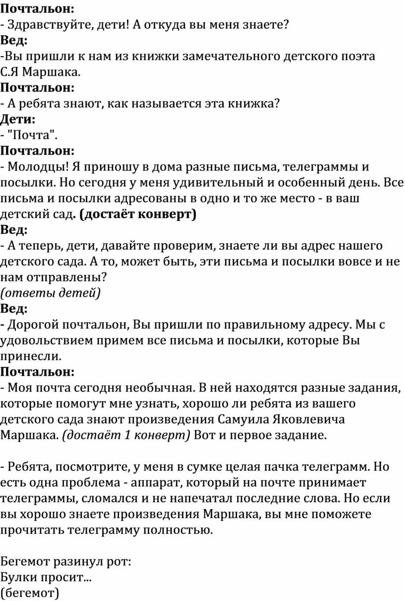 - Ребята, посмотрите, у меня в сумке целая пачка телеграмм. Но есть одна проблема - аппарат, который на почте принимает телеграммы, сломался и не напечатал последние слова. Но если вы хорошо знаете произведения Маршака, вы мне поможете прочитать телеграмму полностью.