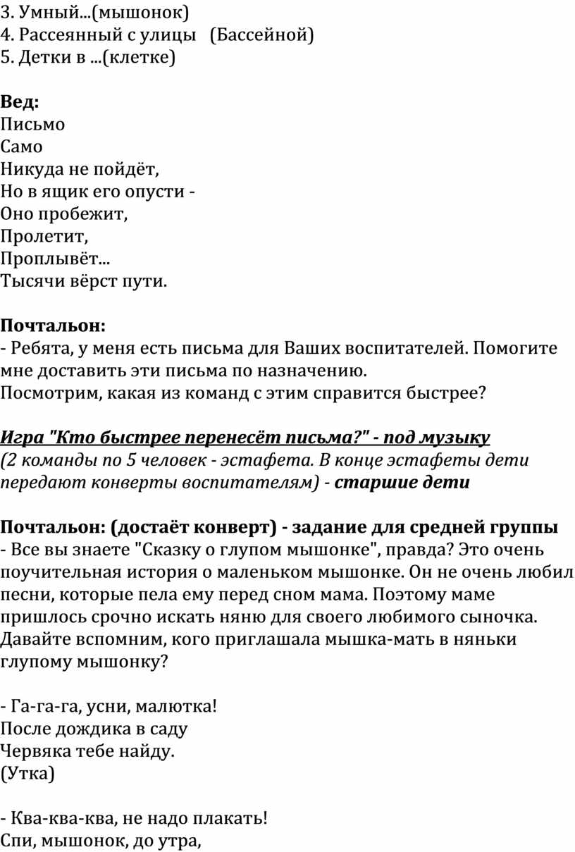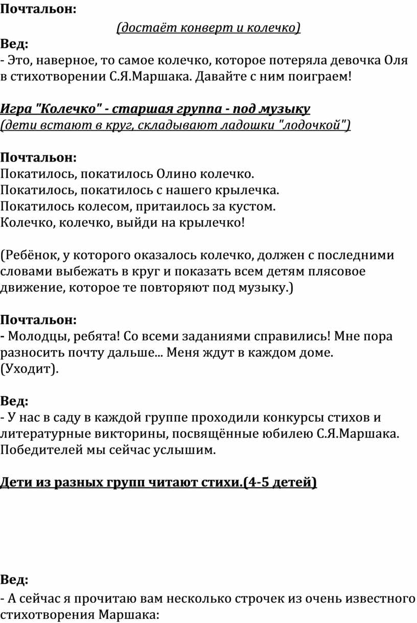 - Моя почта сегодня необычная. В ней находятся разные задания, которые помогут мне узнать, хорошо ли ребята из вашего детского сада знают произведения Самуила Яковлевича Маршака. (достаёт 1 конверт) Вот и первое задание.
