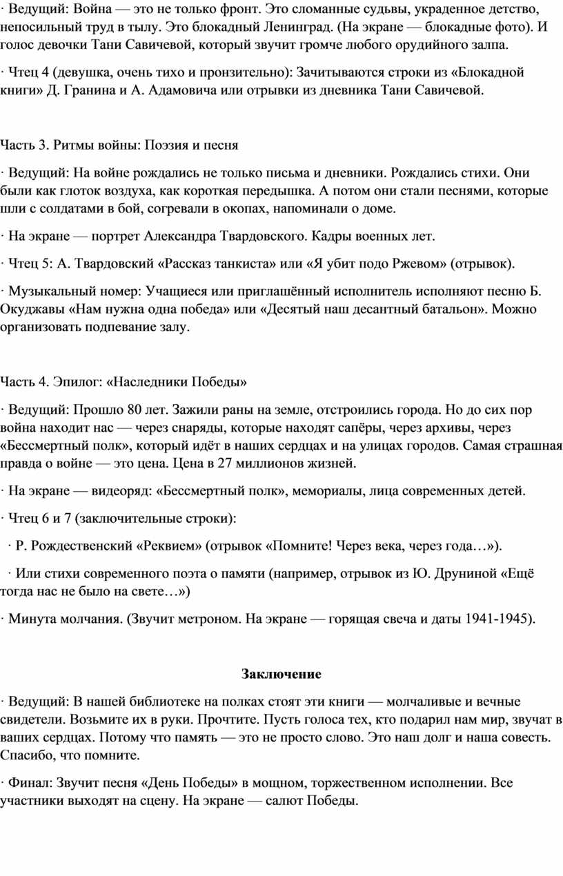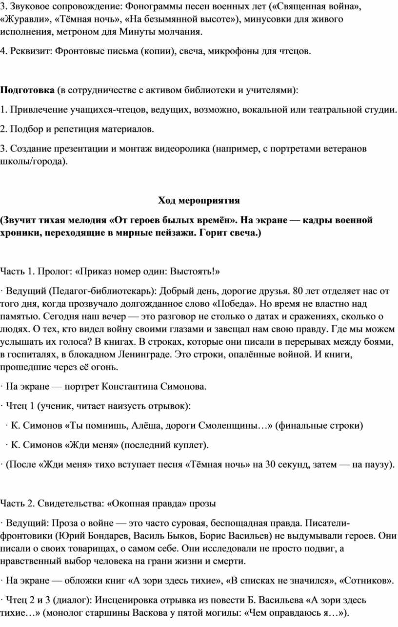 · Ведущий (Педагог-библиотекарь): Добрый день, дорогие друзья. 80 лет отделяет нас от того дня, когда прозвучало долгожданное слово «Победа». Но время не властно над памятью. Сегодня наш вечер — это разговор не столько о датах и сражениях, сколько о людях. О тех, кто видел войну своими глазами и завещал нам свою правду. Где мы можем услышать их голоса? В книгах. В строках, которые они писали в перерывах между боями, в госпиталях, в блокадном Ленинграде. Это строки, опалённые войной. И книги, прошедшие через её огонь.
