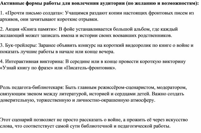 Роль педагога-библиотекаря: Быть главным режиссёром-сценаристом, модератором, связующим звеном между литературой, историей и сердцами детей. Важно создать доверительную, торжественную и личностно-окрашенную атмосферу.