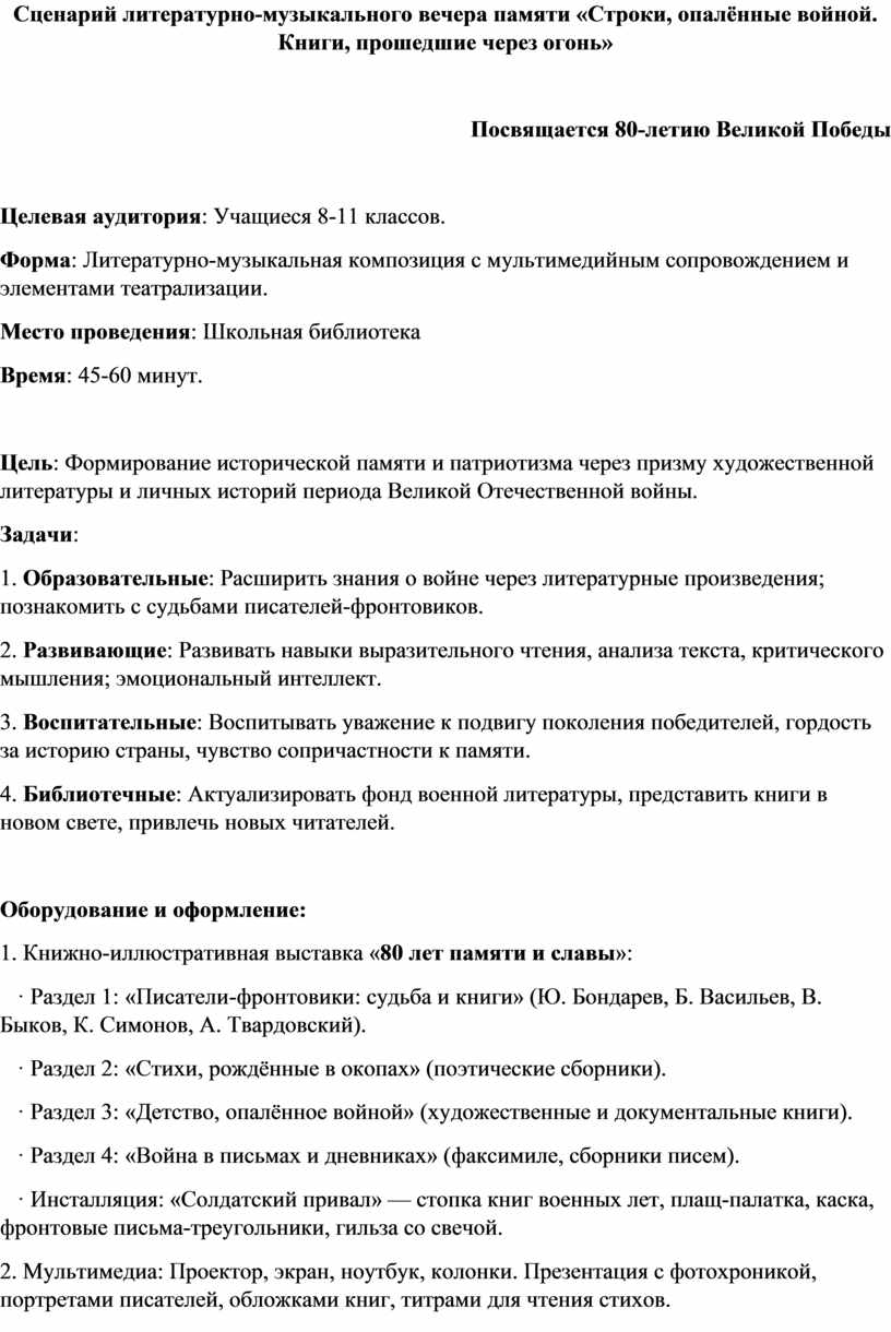 Сценарий литературно-музыкального вечера памяти «Строки, опалённые войной. Книги, прошедшие через огонь»