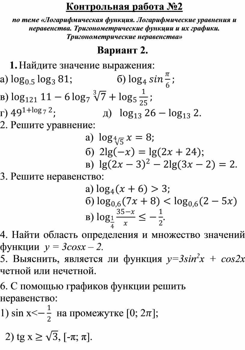Контрольная работа №2 по теме «Логарифмическая функция. Логарифмические уравнения и неравенства. Тригонометрические функции и их графики. Тригонометрические неравенства» Вариант 1. 1. Найдите значение выражения: а) в) г) 2. Решите уравнение: а) б) 2 в) 3. Решите неравенство: а) б) в) 4. Найти область определения и множество значений функции у = sinx + 2 5.