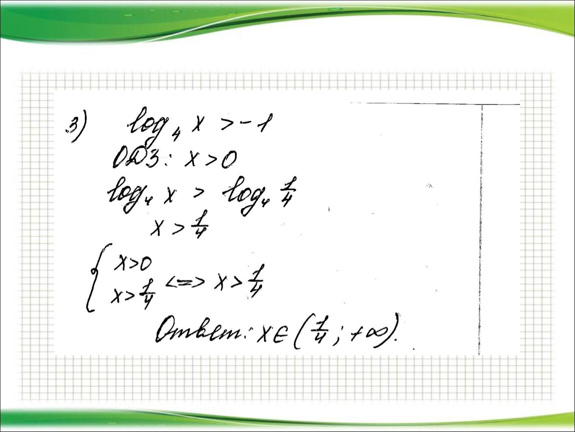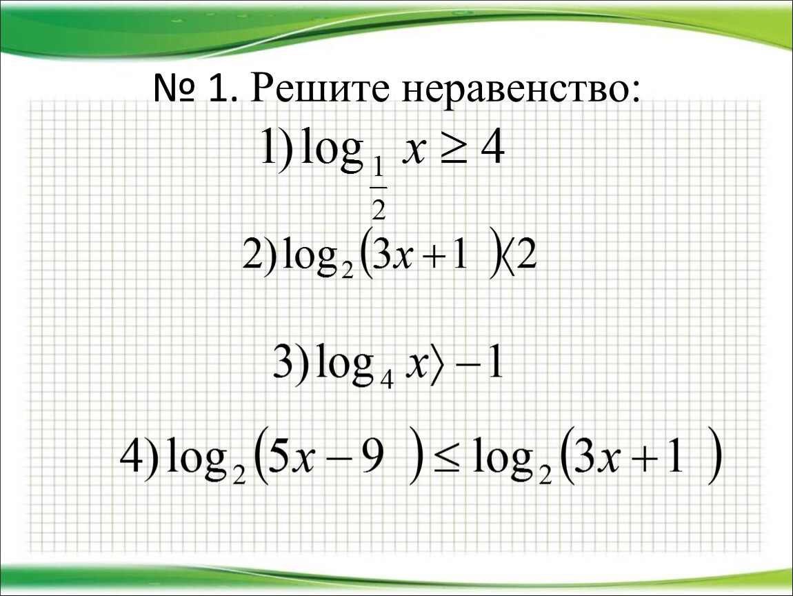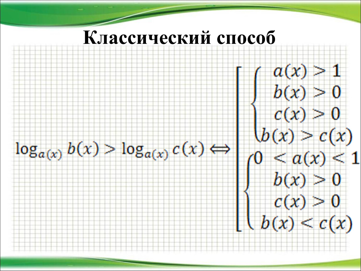 2) Представить (если возможно) левую и правую части неравенства в виде логарифмов по одному и тому же основанию.